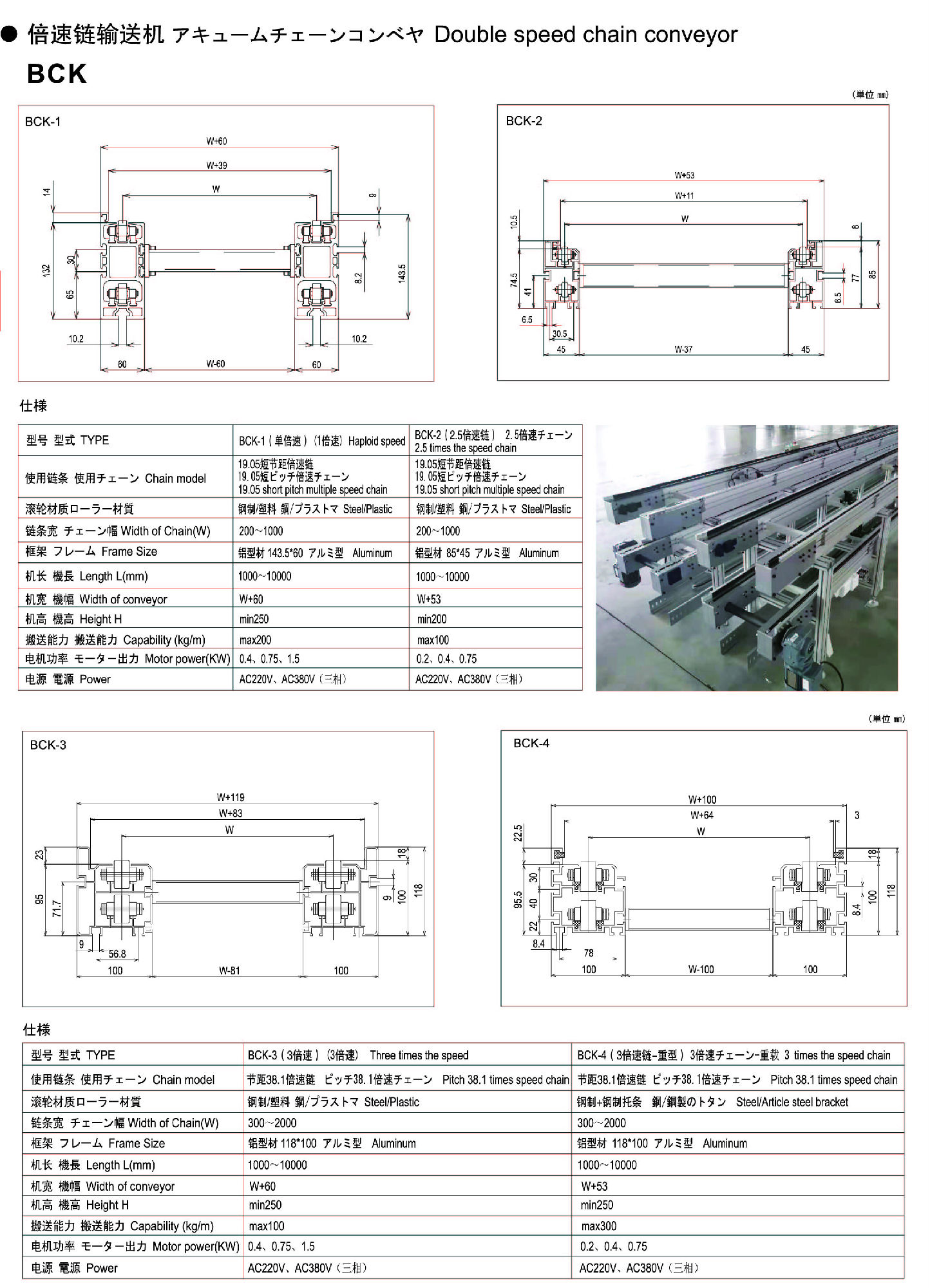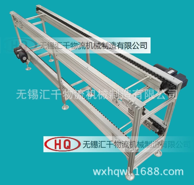 倍速鏈用于無聊輸送的鏈條與鏈傳動采用的鏈條類似,工程上最常用的輸送鏈條為滾子鏈。在輸送線上,鏈條的移動速度保持不變,但鏈條上方被輸送的工裝板及工件可以按照使用者的要求控制移動節拍,在所需要停留的位置停止運動,由操作者進行各種裝配操作,完成上述操作后再使工件繼續向前移動輸送。所以倍速輸送鏈也可以稱為節拍輸送鏈、自由節拍輸送鏈、倍速鏈、差速鏈、差動鏈。