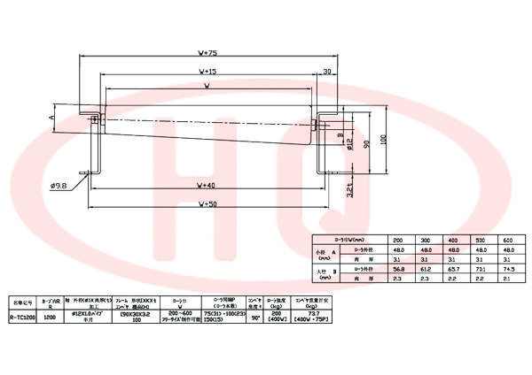 | 型 號 | 轉彎半徑 R | 軸外徑(φ)×壁厚(t) 加工 | 支架形狀I×K×t 輸送機高(H) | 滾 筒 幅 寬 W | 滾筒間距 P (滾筒數) | 滾筒 角度 θ | 滾筒強度 (kg) | 輸送機重量 (kg) | |||||