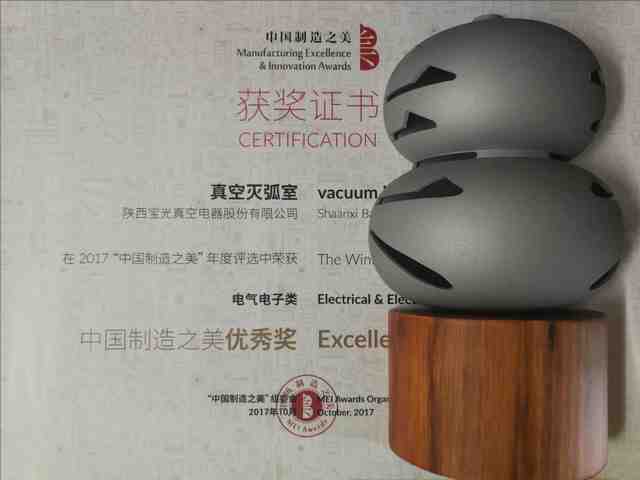 2017“中國制造之美”年度評選歷經專業評委組長達2個月的評選,最終從13個組別4309件參賽作品中評選出53件產品,獲得“中國制造之美”的大獎、優秀獎及單項獎。寶光真空滅弧室經過初評、復評、公示等環節,最終獲得電氣電子類產品優秀獎。該獎項的獲得,不但是對我公司不斷創新、精益求精的工匠精神的肯定,也將提升寶光的企業形象,為寶光產品贏得更廣泛知名度和美譽度。(崔亦兵)