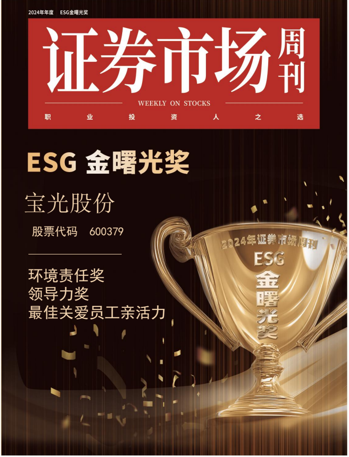 11月23日,2024《證券市場周刊》ESG“金曙光獎”及“十大ESG領(lǐng)先企業(yè)榜單”評選結(jié)果揭曉。寶光股份憑借在ESG領(lǐng)域的卓越表現(xiàn),榮獲“金曙光環(huán)境責(zé)任獎”“十大ESG領(lǐng)先企業(yè)—最佳關(guān)愛員工親活力獎”,寶光股份黨委書記、董事長謝洪濤榮獲“金曙光領(lǐng)導(dǎo)力獎”。這是對寶光股份及企業(yè)“帶頭人”在ESG管理方面(非財務(wù)管理方面)高水平表現(xiàn)的高度贊譽,也是對企業(yè)在ESG實踐方面持續(xù)努力成果的肯定。