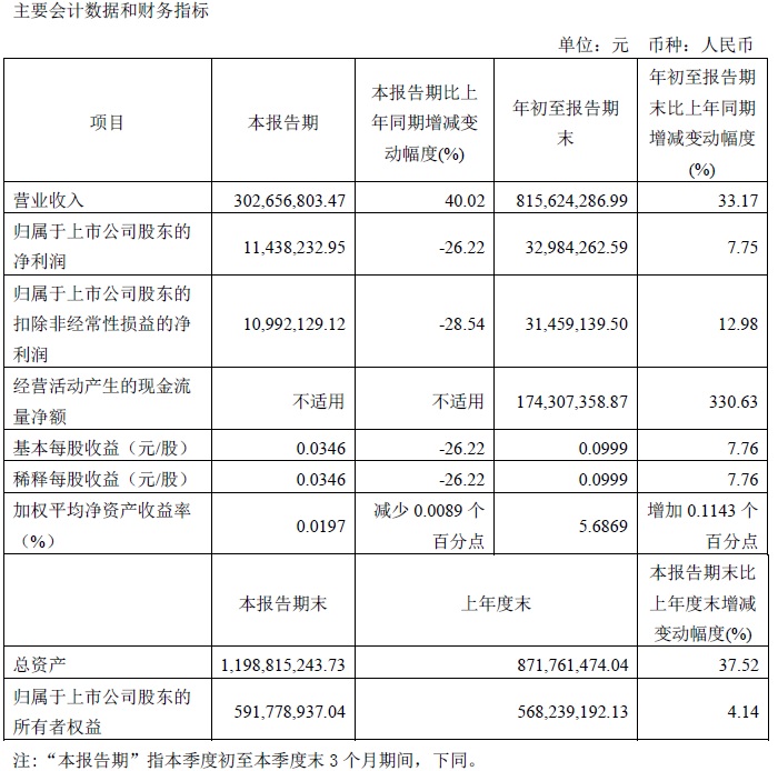 寶光股份2021年三季度主要財務指標