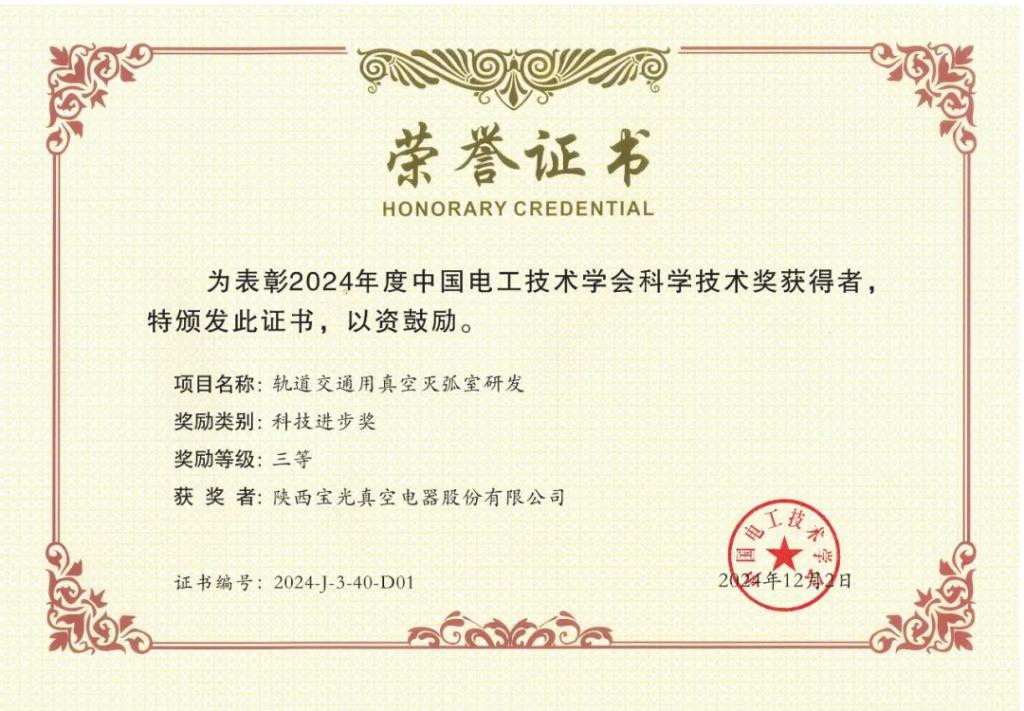 項目名稱:軌道交通用真空滅弧室研發(fā)。項目簡介:本項目研發(fā)出的BGH2570、BGH2580、BGH2590/R、BGH2530等系列化產品,可替代進口產品。4種產品全部通過了裝車運行驗證,部分產品實現(xiàn)了小批量供貨。其中BGH2570型產品于2023年9月通過了中國機械工業(yè)聯(lián)合會產品鑒定,技術水平達到國際領先。2021年至2024年累計銷量超過1000只,累計銷售額超過超過600萬元。